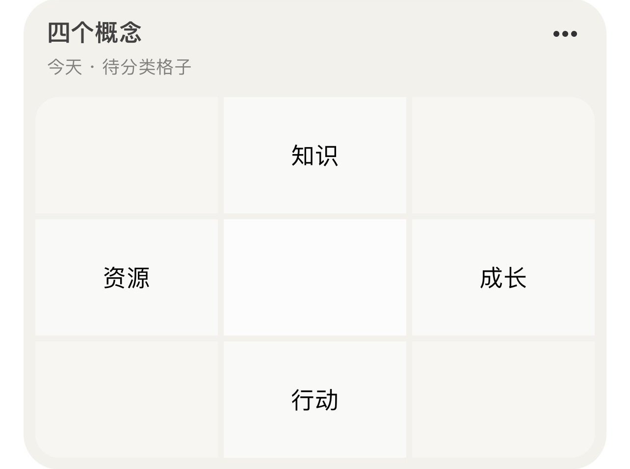 比如,“知识”这个概念,它是一种高维的、抽象的、在你头脑中的存在的事物,你自然而然会把这个概念放在GirdMemo位于上方的格子中。